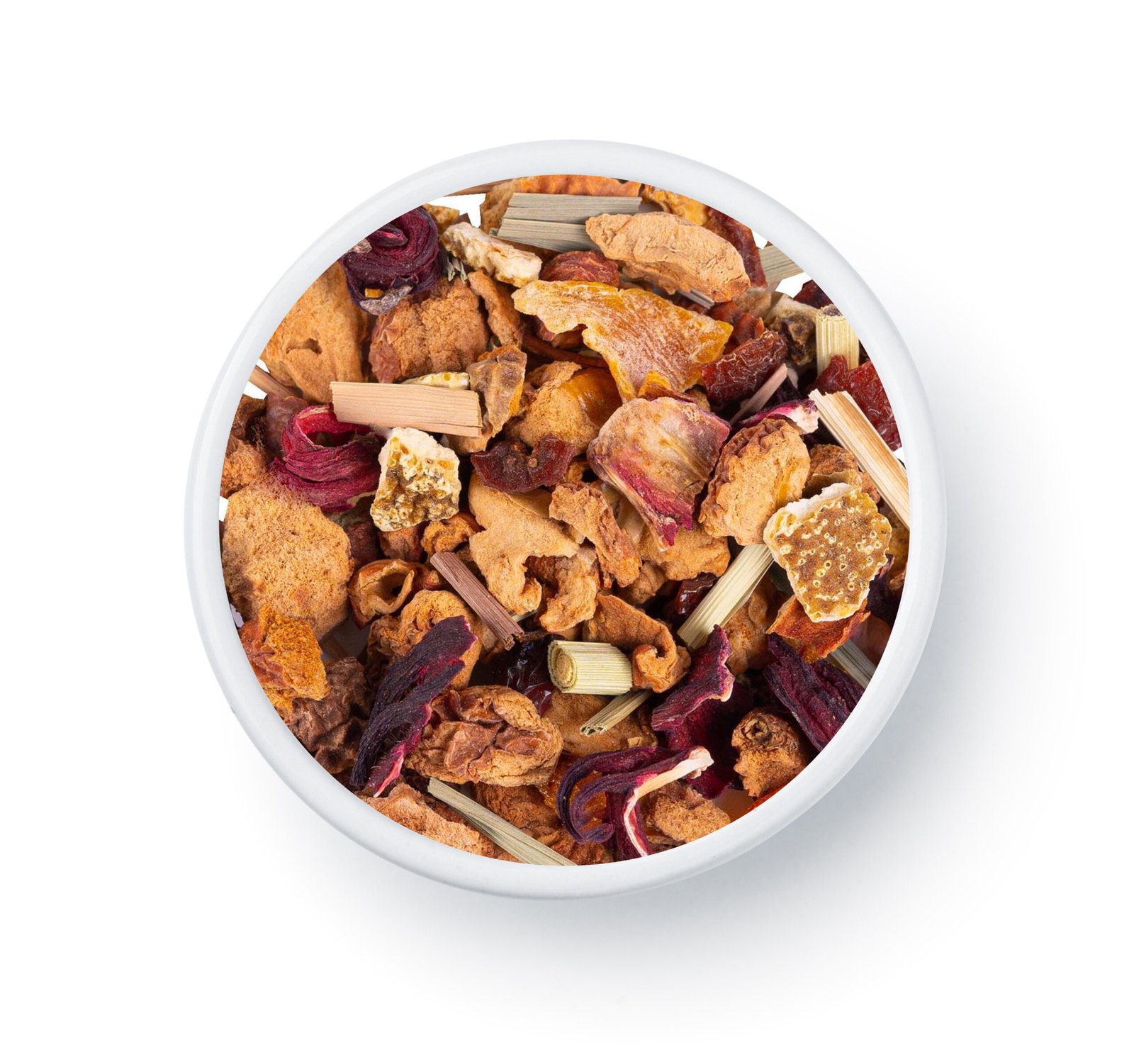écorces d’orange, hibiscus, cynorrhodon, arôme naturel de fruit de la passion et d’orange.