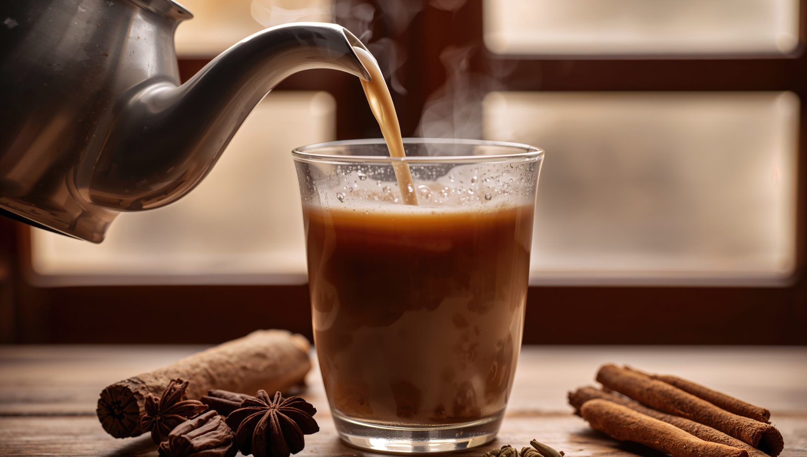 Thé noir chaï traditionnel, riche en épices comme la cannelle, le gingembre, la cardamome et le clou de girofle, une boisson chaleureuse et réconfortante.
