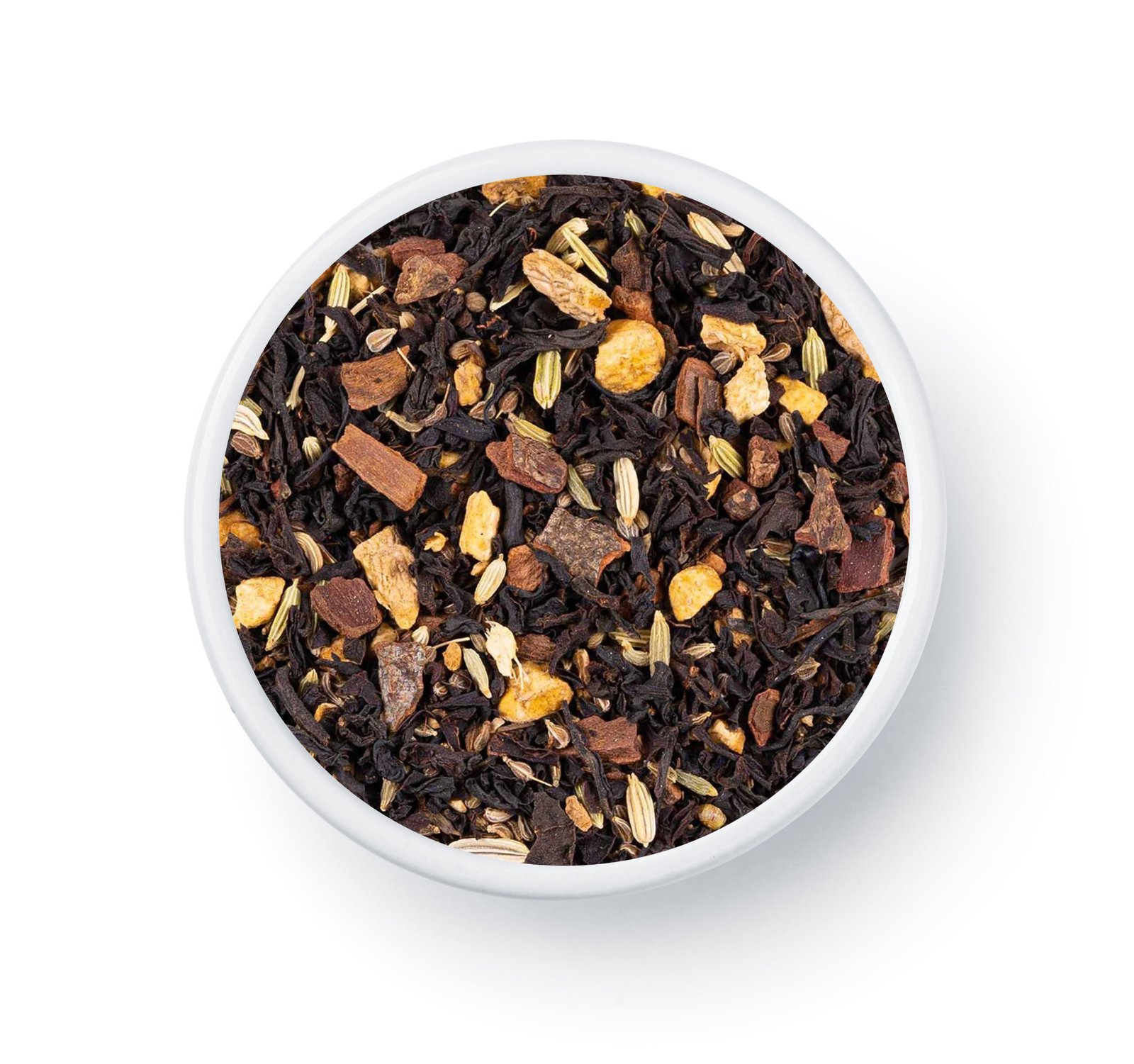 Composition : Thé Noir Assam, Bâtons de cannelle, Fenouil, gingembre, anis, cardamome moulue, clou de girofle.